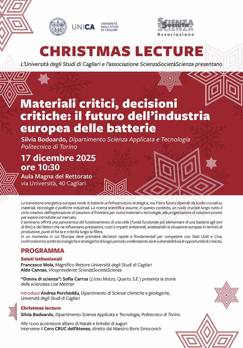 On Wednesday, December 17, 2025, at 10:30 a.m., in the Aula Magna of the Rectorate at Via Università 40, the Christmas Lecture “Critical Materials, Critical Decisions: The Future of the European Battery Industry,” given by Professor Silvia Bodoardo of the Polytechnic University of Turin, will be held.