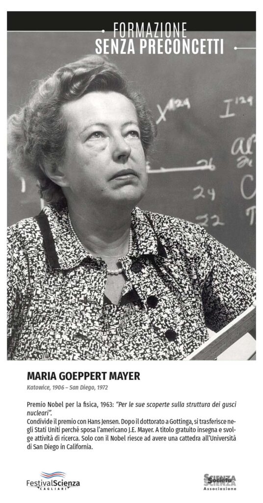 In the early 1940s, as part of the Manhattan Project, Goeppert Mayer, despite not having a formal position, worked at Columbia University with Harold Urey on the separation of U-235 from natural uranium. In 1946, Joseph Mayer was appointed professor in the Chemistry Department at the University of Chicago. Once again, Maria followed her husband without any academic position, but was able to work as a volunteer, unpaid, Associate Professor at the newly established Institute for Nuclear Studies. She then taught courses in the Physics Department and supervised several graduate students on a voluntary basis. And it was thanks to an offer from her first graduate student, Robert G. Sachs, that she landed a paid part-time position as a senior physicist at Argonne National Laboratory (now Fermilab). There, she expanded her expertise in the complex mathematics of nuclear physics and studied nuclear properties through the periodic table. She knew very little about nuclear physics, and it took her some time to find her way in this, for her, new field. But in the atmosphere of Chicago, it was quite easy to learn nuclear physics. She owed much to numerous discussions with various scientists, and, in particular, with Enrico Fermi, who was always patient and available. From here began the research that led to her Nobel Prize. Among the problems she addressed, in connection with the origin of chemical elements, she noted that the abundance of elements, their stability, as well as other characteristics, could be associated with particular numbers of protons and neutrons (2, 8, 20, 28, 50, 82, 126), called magic numbers, and she came to propose a model of a nucleus with stable layers similar to the atomic model. While writing the paper, she came across an article that proposed a substantially similar solution. Maria did not then know Jensen, a physicist from Heidelberg, one of the authors, but in 1951 they began a fruitful collaboration and friendship, culminating in the publication of their book Elementary Theory of Nuclear Shell Structure (1955). For their contributions to the subject, they jointly won the 1963 Nobel Prize. She was the first woman to win a Nobel Prize in theoretical physics, and second overall after Marie Curie.