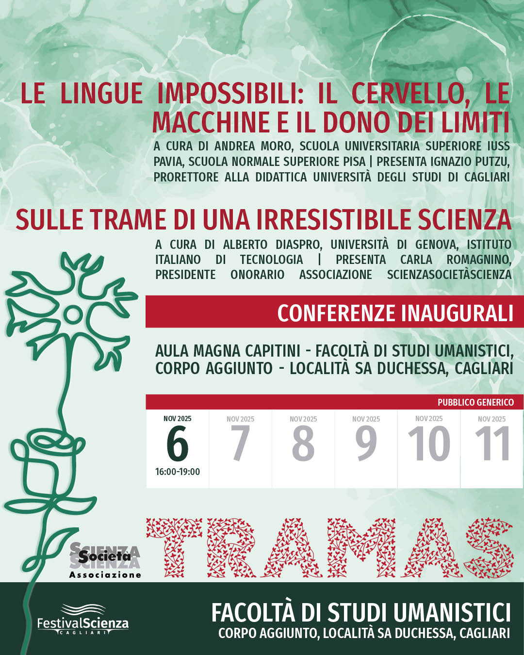 “Tramas e filu” con cui ci muoveremo lungo un filo narrativo che intreccia il metodo con la conoscenza, la bellezza con la scoperta di una irresistibile scienza. Il passaggio dal segno scritto a quello figurativo ispirato da Galilei è il telaio su cui si realizza la trama tra fisica, biologia, astronomia, chimica e arte. Così la scienza è irresistibile nell’innescare la curiosità innata negli umani.