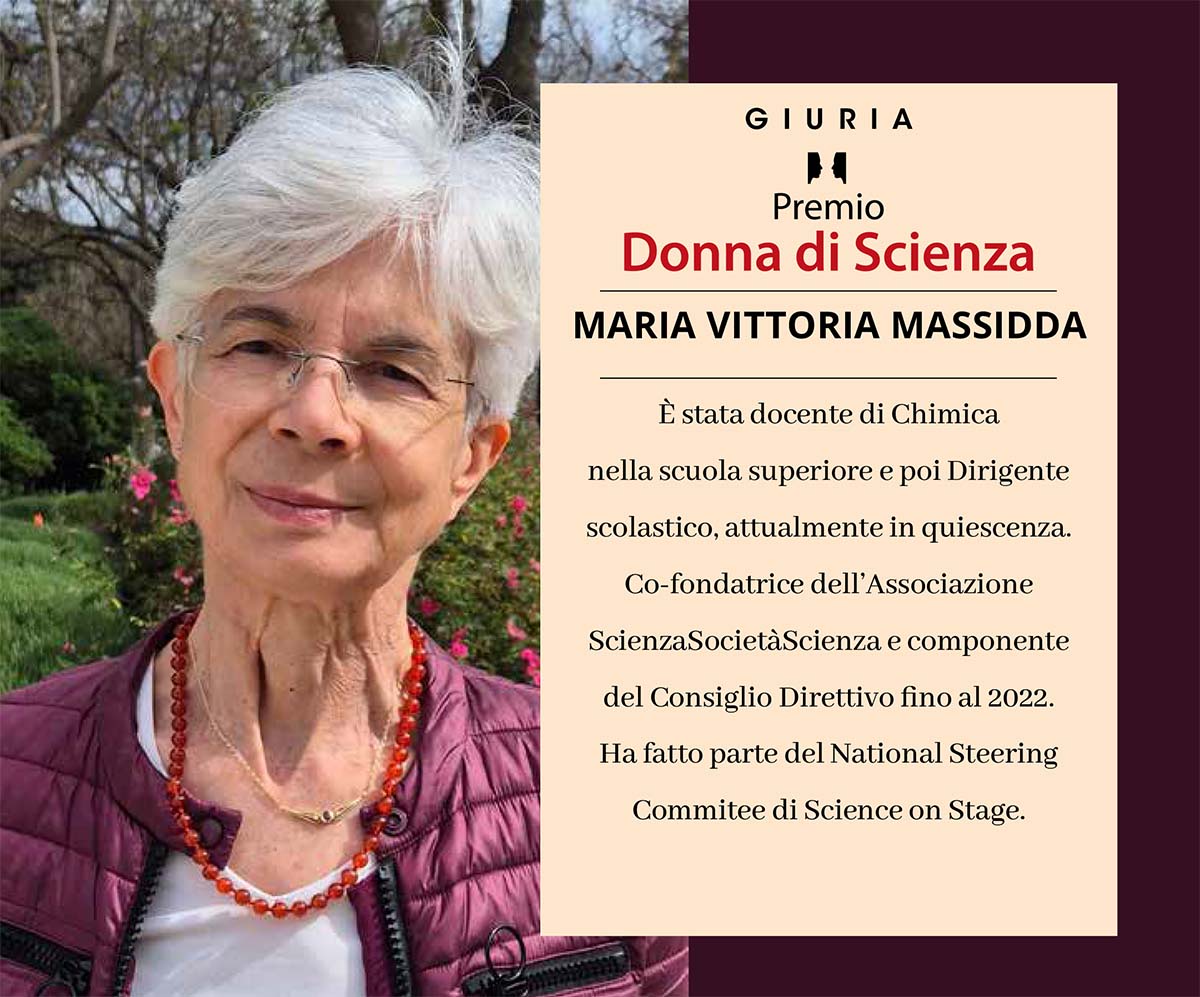 Maria Vittoria Massidda è stata docente di Chimica nella scuola superiore e poi Dirigente scolastico, attualmente in quiescenza. Co-fondatrice della Associazione ScienzaSocietàScienza e componente del Consiglio Direttivo fino al 2022. Ha fatto parte del National Steering Commitee di Science on Stage.
